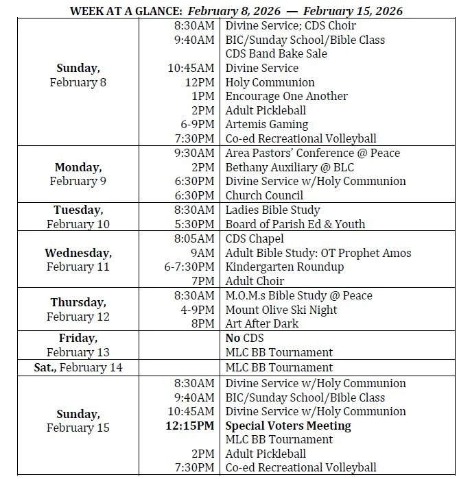 Sunday Morning Adult Bible Class Schedule: Pastor Soule is leading a study of the early church entitled “The Apostles’ Teaching and Fellowship” on Sundays, February 8 and 15, in the Social Hall at 9:40am. On Sunday, February 22, President Pfeifer will be providing an update on Bethany Lutheran College.