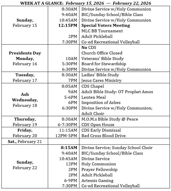 Sunday Morning Adult Bible Class: Pastor Soule concludes a study of the early church entitled “The Apostles’ Teaching and Fellowship” in the Social Hall at 9:40am on Sunday, February 15. On Sunday, February 22, President Pfeifer is providing an update on Bethany Lutheran College.