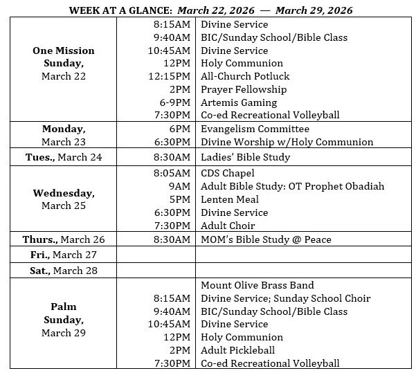 Adult Sunday Bible Class: On Sunday, March 22, from 9:40-10:30am in the Social Hall, Dr. Springer will present a historical overview of Mount Olive Lutheran School. Join Pr. Ulrich on Sunday, March 29, as he continues his Bible study based on The Screwtape Letters by C. S. Lewis.