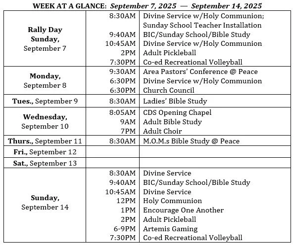 Sunday, September 7 Adult Bible Study: 9:40am in the Social Hall. Join us for the first part of a special two-part study entitled “21st Century Lutheran Identity: ELS & ELCA – What’s the Difference?” by special guest Prof. Rev. Thomas Rank.