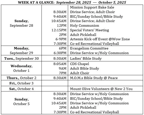 For more updates and all other new announcements, pick up your copy of the October edition of the Olive Press from the narthex table. The Olive Press is also available on the Mount Olive website: mtolivelutheran.org/publications. For Mount Olive members who receive the Weekly Announcements via email, note that the October 2025 Olive Press is attached to the September 28 Weekly Announcements.